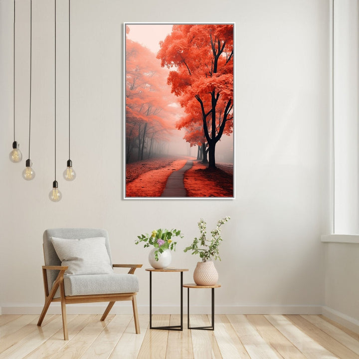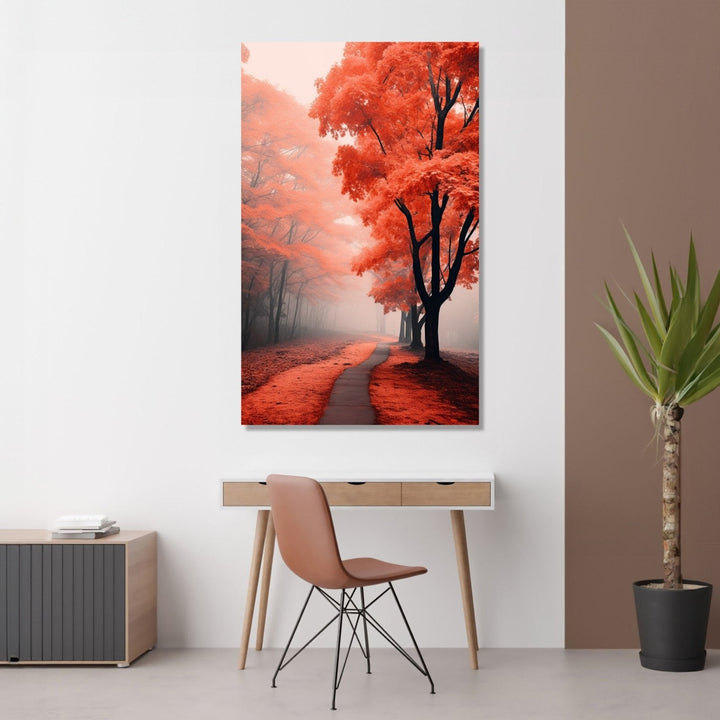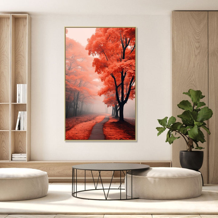 "The Fall Road 1" showcases a misty road through orange and red trees, creating an enchanting scene of autumnal beauty.