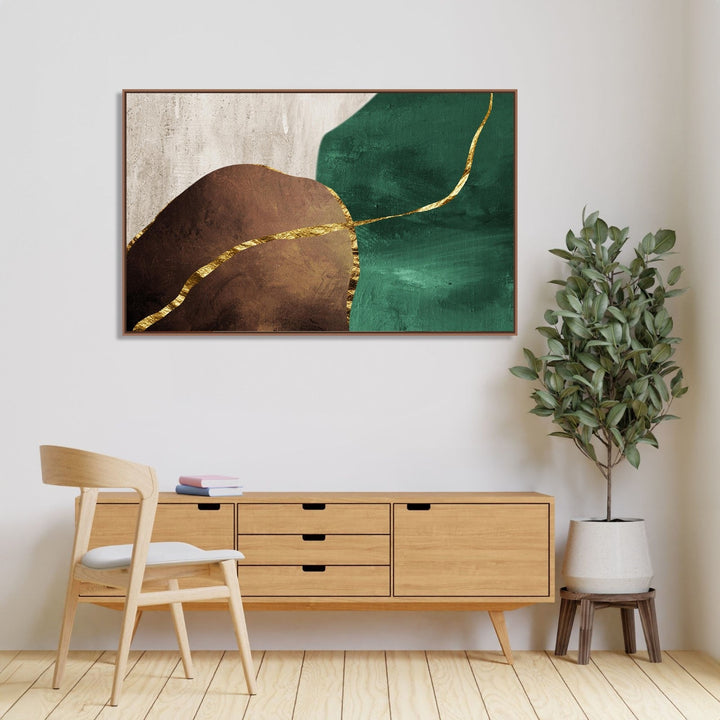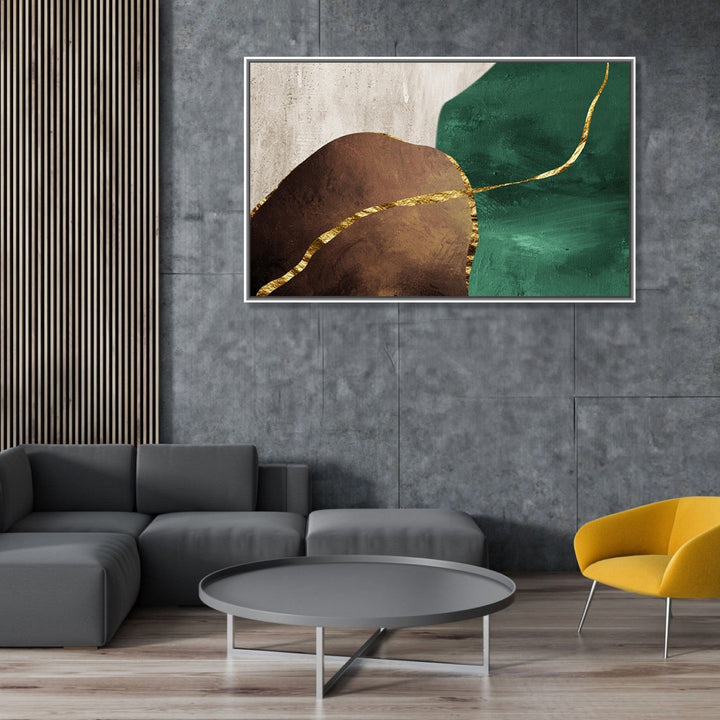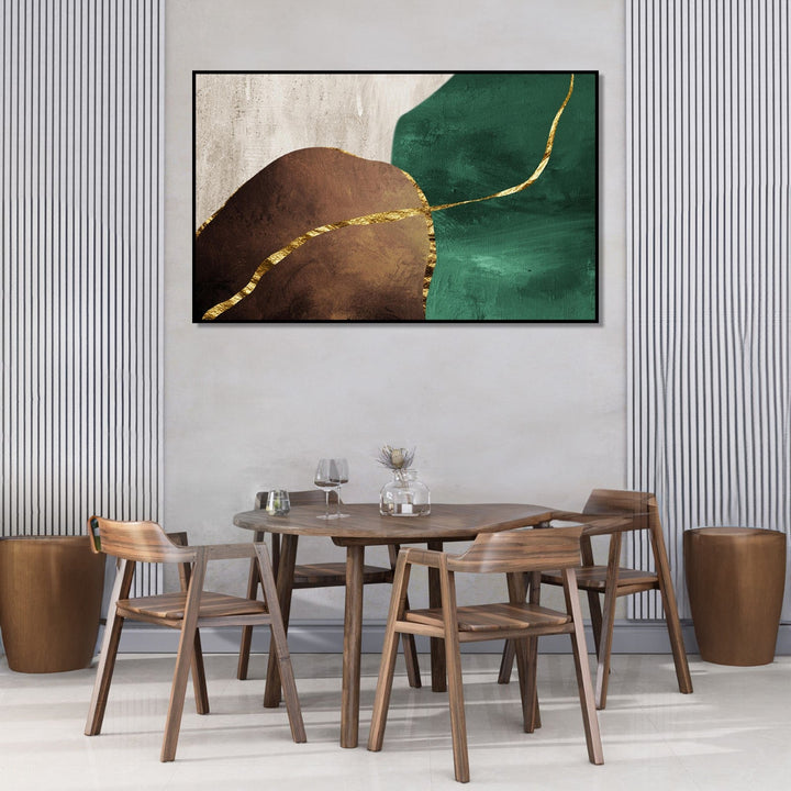 This handmade painting features a stunning combination of gold lines, green, grey, and brown colors, creating a visually striking and harmonious composition. The abstract minimalist style of the painting adds a sense of simplicity and elegance, while the abstract texture adds depth and dimension to the piece. The artist's use of color and line work creates a sense of movement and energy within the painting, drawing the viewer in and inviting them to explore the intricate details of the artwork. Overall, this abstract painting is a beautiful and captivating piece that would make a unique and eye-catching addition to any art collection.