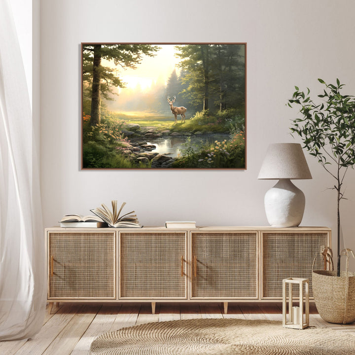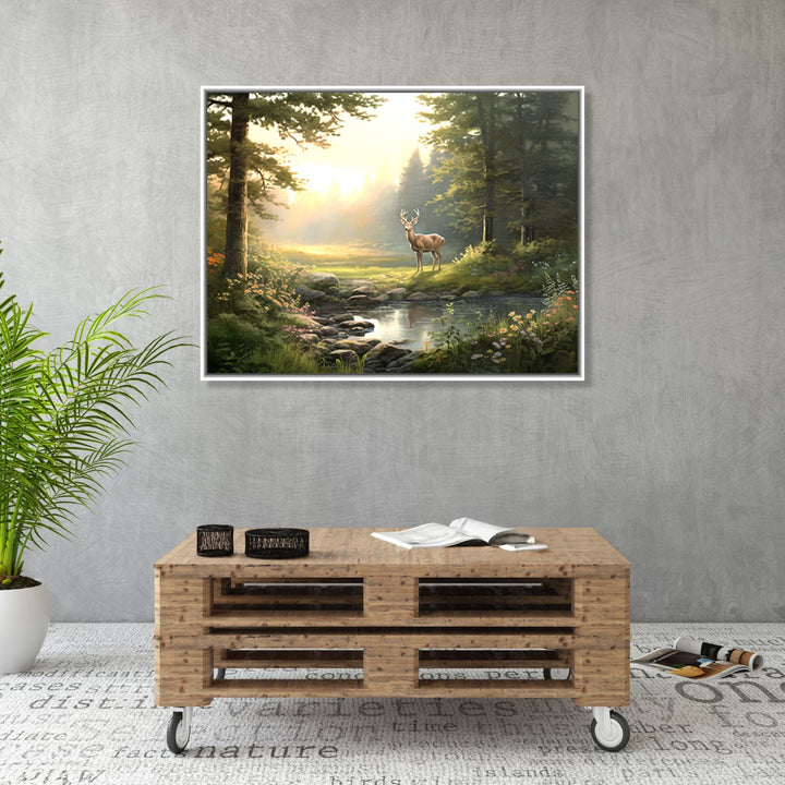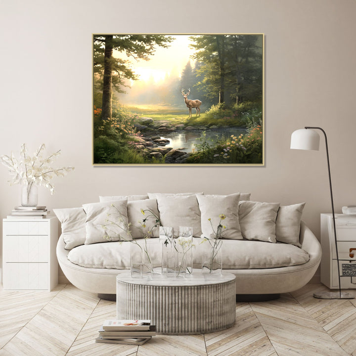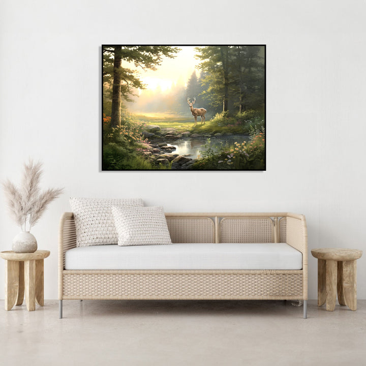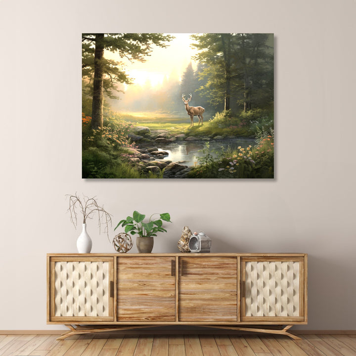 Serenity in the Wilderness' captures the tranquil beauty of a jungle scene, with an olive green color palette dominating the lush foliage. In the foreground, a serene pond reflects the surrounding greenery, while a graceful deer stands peacefully on the open ground behind it. The artwork invites viewers to immerse themselves in the peacefulness and serenity of nature.