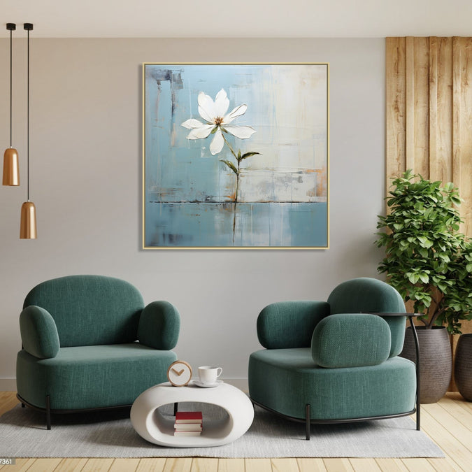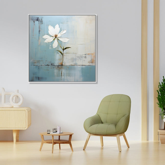This painting features a delicate plant with two petite leaves and a large, striking white flower. The plant stands out against a backdrop of light blue, which is depicted in an manner. The simplicity of the subject matter and the softness of the colors create a serene and tranquil atmosphere. The focus is on the beauty and elegance of the plant, capturing a sense of purity and grace.