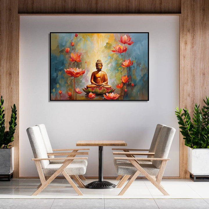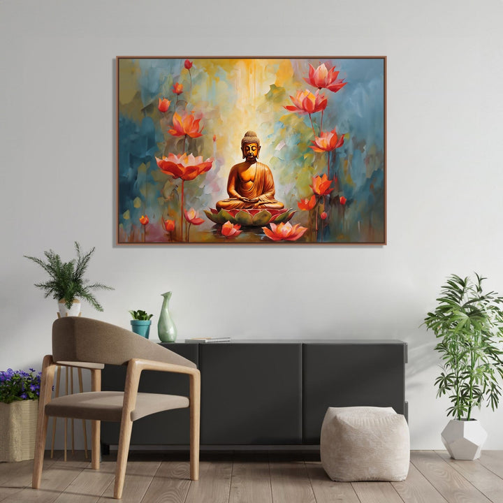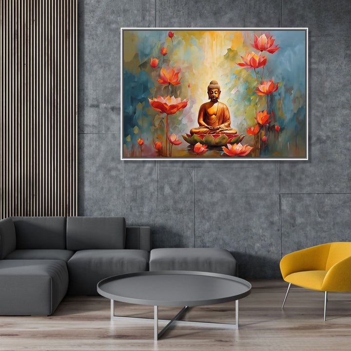 This captivating painting depicts a serene Buddha in deep meditation, set against a vibrant and patchy background filled with an array of striking colors. The lighter hues create a sense of tranquility, while the bursts of orange add a touch of warmth and energy. In the foreground, delicate lotus flowers in various shades of orange gracefully bloom, symbolizing purity and enlightenment. This artwork beautifully captures the essence of inner peace and spiritual awakening, inviting viewers to immerse themselves in its harmonious and captivating presence.
