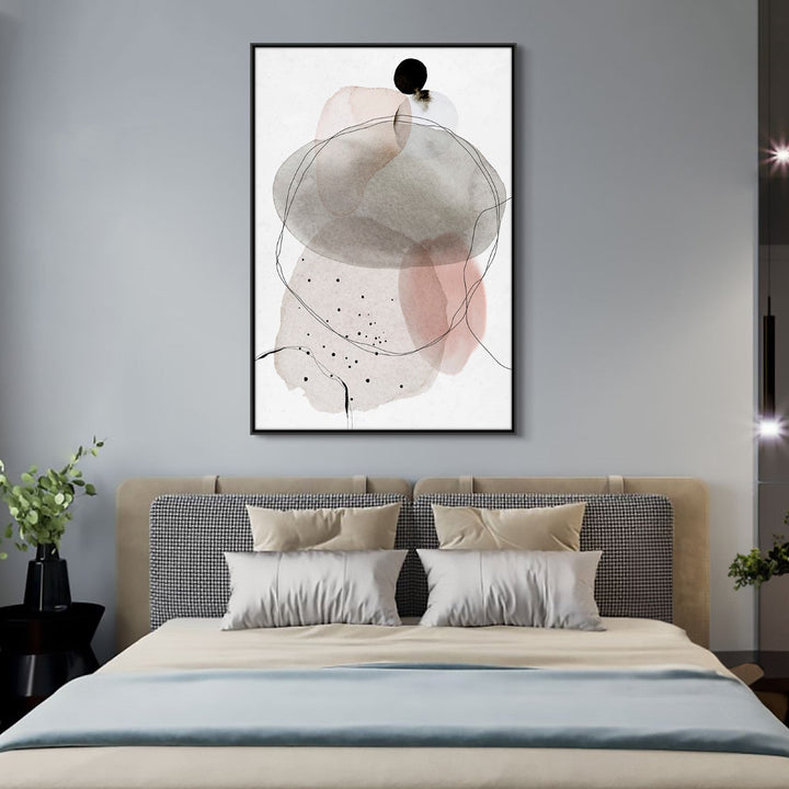 This handmade painting is a stunning abstract piece that showcases a beautiful combination of translucent shapes in shades of black, gray, and pink. The overlapping shapes create a mesmerizing effect, drawing the viewer in to explore the intricate details within the artwork. Delicate black lines and dots add a sense of whimsy and playfulness to the composition, enhancing the overall aesthetic appeal of the painting. The interplay of colors and forms within the piece creates a sense of depth and movement, giving the impression that the shapes are constantly shifting and evolving before the viewer's eyes. This painting is a true work of art that is sure to captivate and inspire all who gaze upon it.