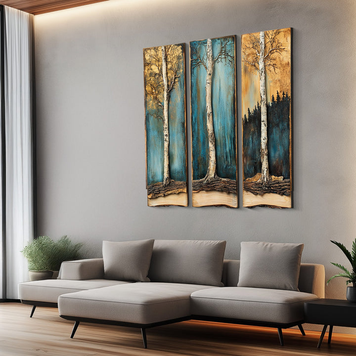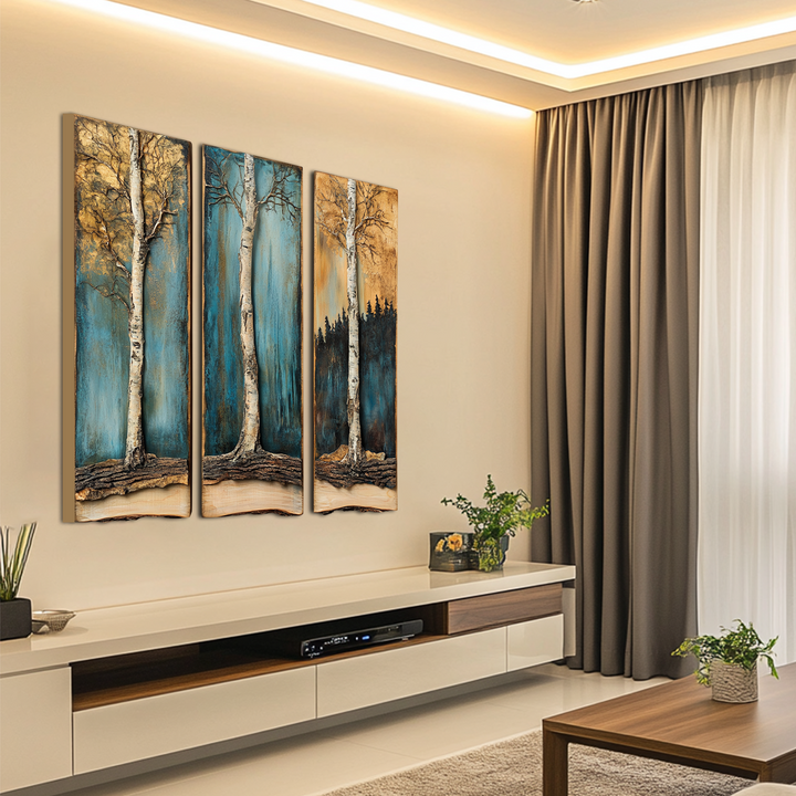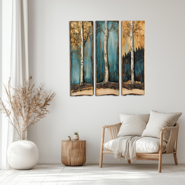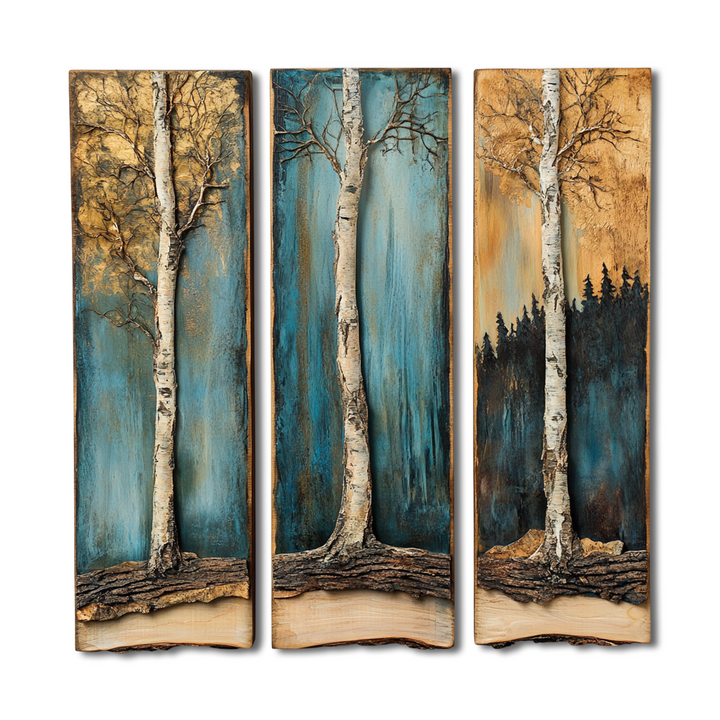 A peaceful depiction of existence anchored in nature. The structures of the birch trees are rich with elaborate bark and root systems that represent steadfastness and development, while the backdrop's shifting colours—from a cool teal to a warm ochre—are congruent with the transitions in seasons and the cycle of life.