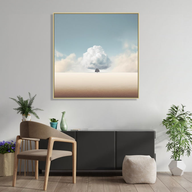 This minimalist painting depicts a solitary tree standing tall under a fluffy white cloud in a serene blue sky. The tree's branches reach out in different directions, creating a sense of balance and harmony. The desert ground beneath the tree is depicted with simple brushstrokes, capturing the vastness and emptiness of the landscape. The overall composition evokes a feeling of tranquility and simplicity, inviting the viewer to appreciate the beauty of nature in its purest form.
