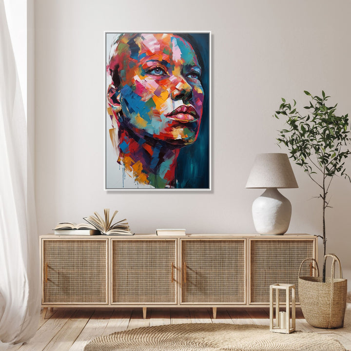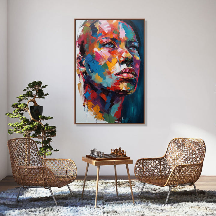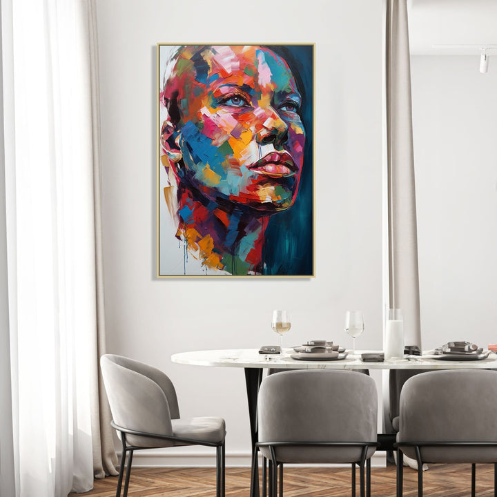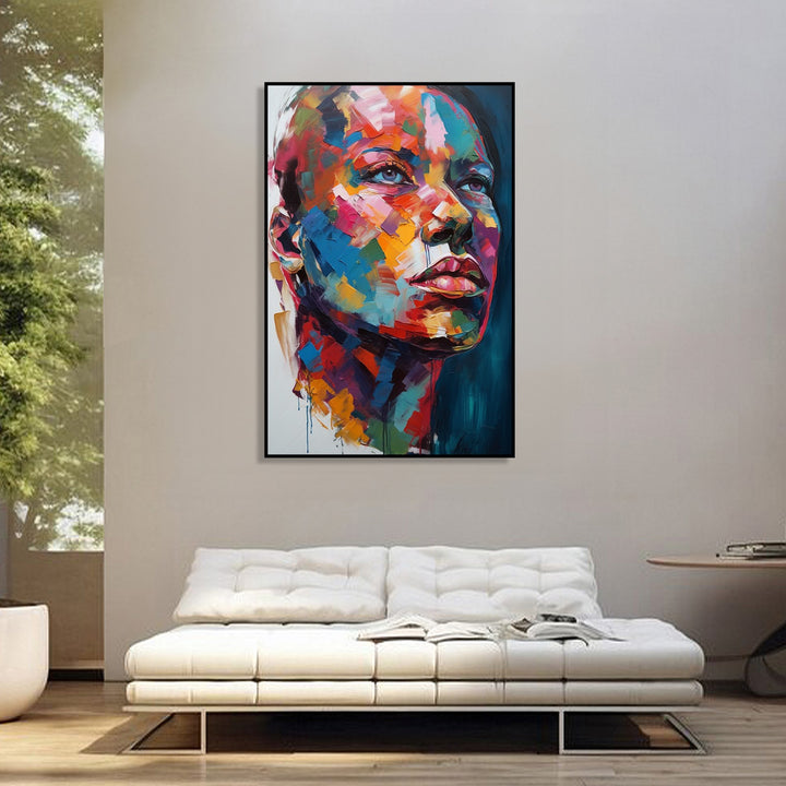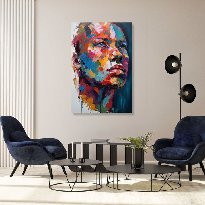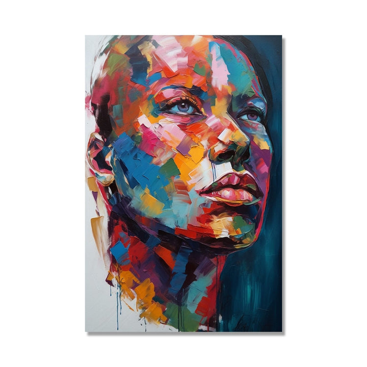 'IntenseÍ__Íî_ Eyes' captures the essence of a woman's face through bold and colourful knife strokes, creating a vibrant and expressive portrayal. Upward gaze portrays a sense of intense and complex thoughts, reflected through the colour palette on the face.