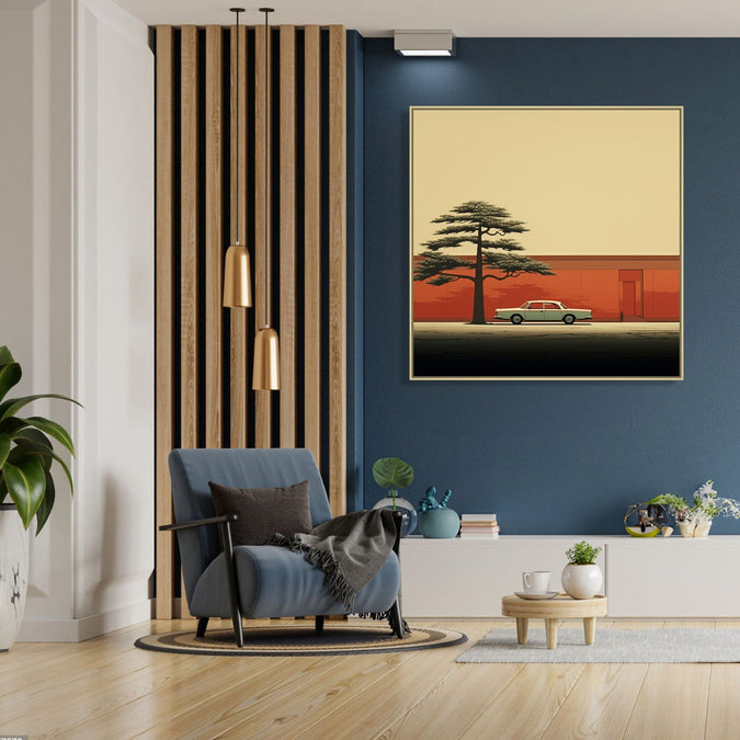 This Asian painting features a vibrant orange wall as its backdrop, with a majestic tree standing tall in the foreground. In front of the tree, there is a car, adding a modern touch to the traditional scene. The colors used in the painting are rich and bold, creating a visually striking composition. The artist skillfully combines elements of nature and contemporary life, inviting viewers to contemplate the harmonious coexistence of tradition and progress.