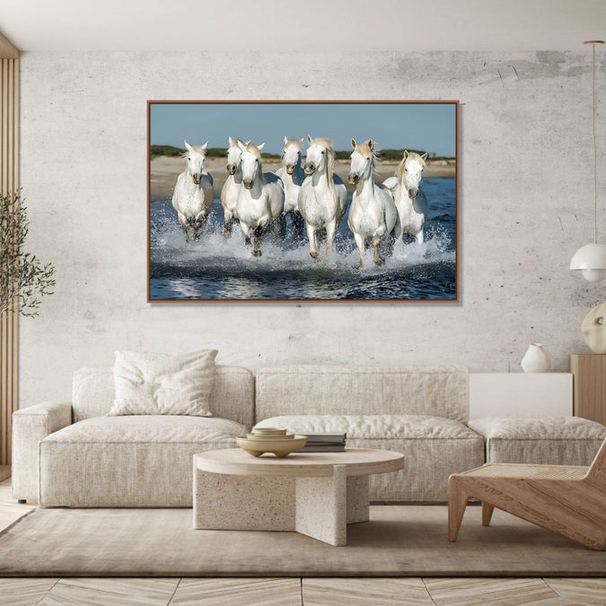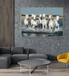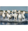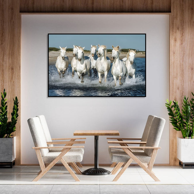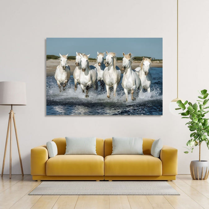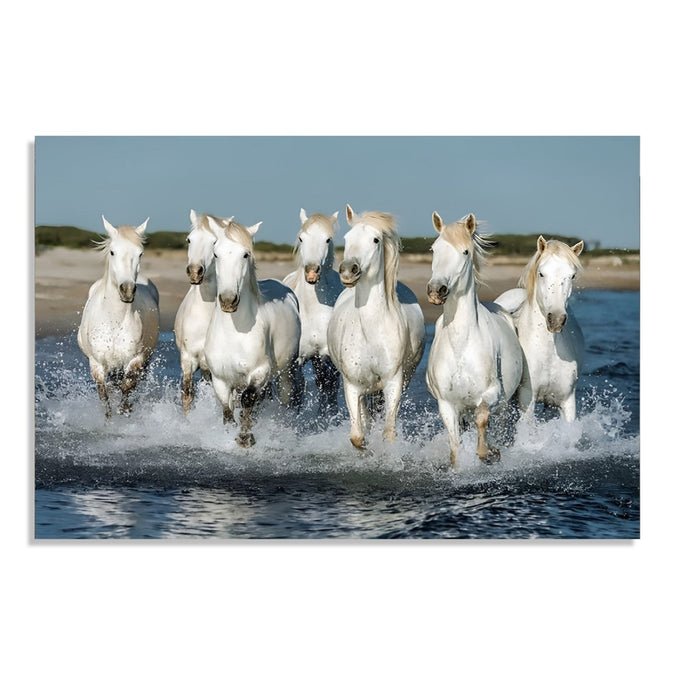 This painting depicts a breathtaking scene of pure white horses galloping gracefully on water. The horses appear incredibly lifelike, their sleek bodies and flowing manes captured in exquisite detail. The backdrop showcases a serene and clear sky, with a peaceful river bank in the distance. The overall effect is one of̨̍_ beauty, as the horses seem to effortlessly glide across the water's surface. It is a stunning portrayal of nature's elegance and the freedom of these majestic creatures.