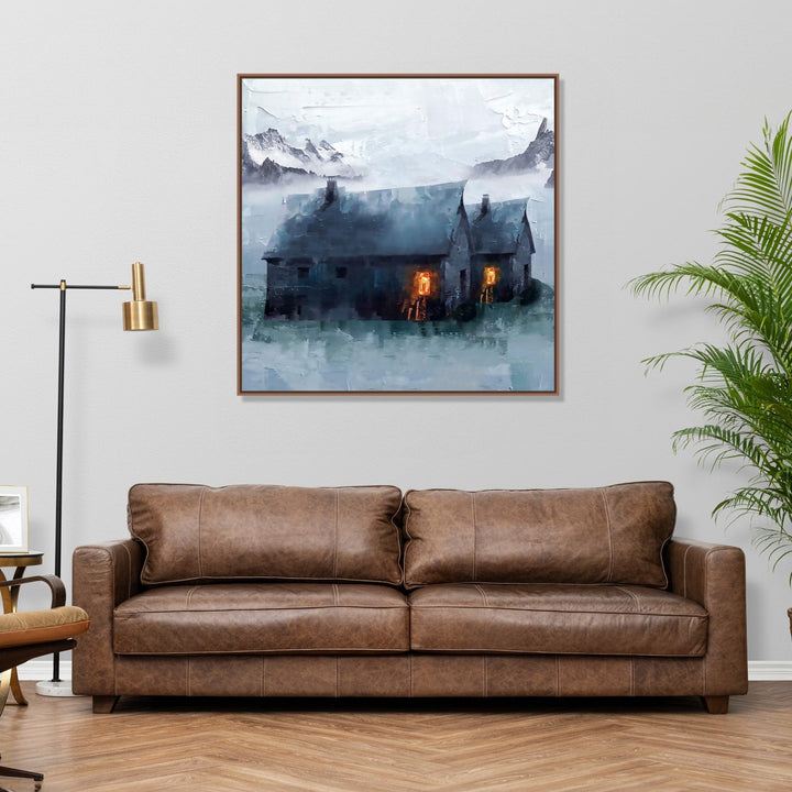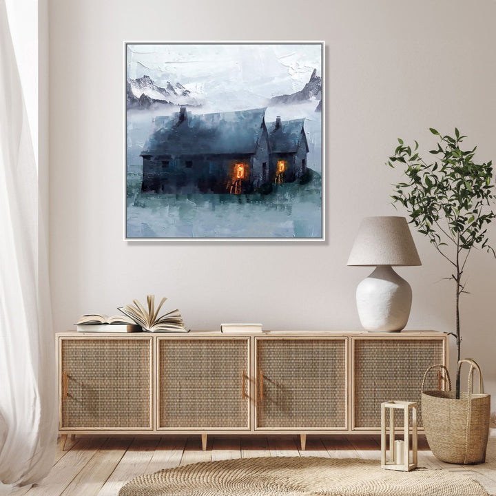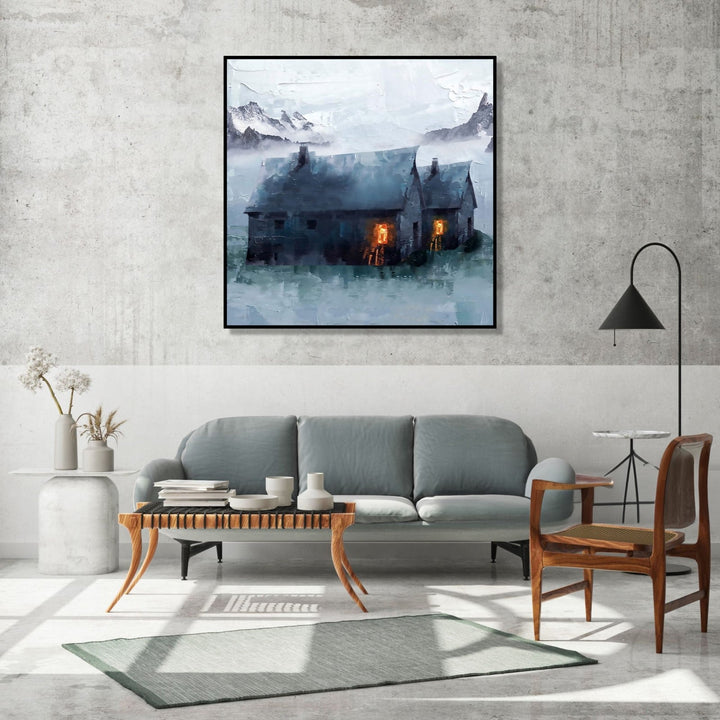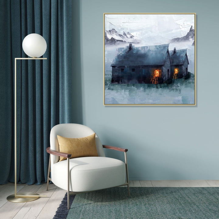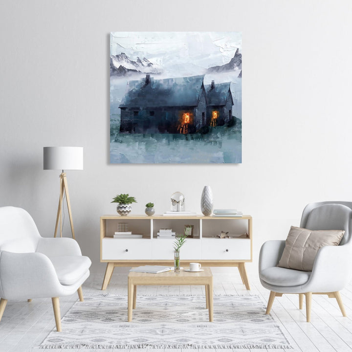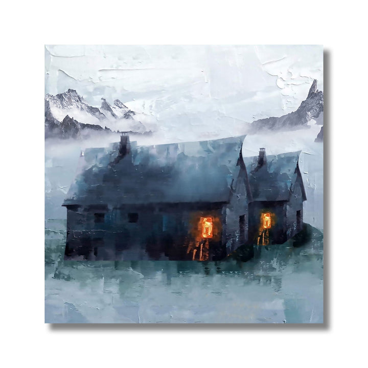 'Winter Cabin' is a serene winter scene depicting two cosy cottages nestled amidst snow-covered mountains. The warm glow emanating from the windows creates a captivating contrast against the cold, wintry landscape.