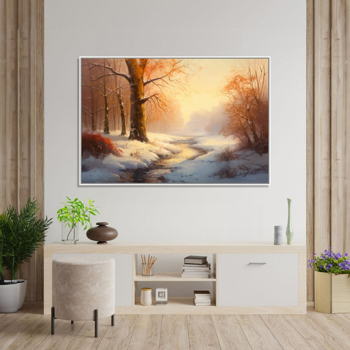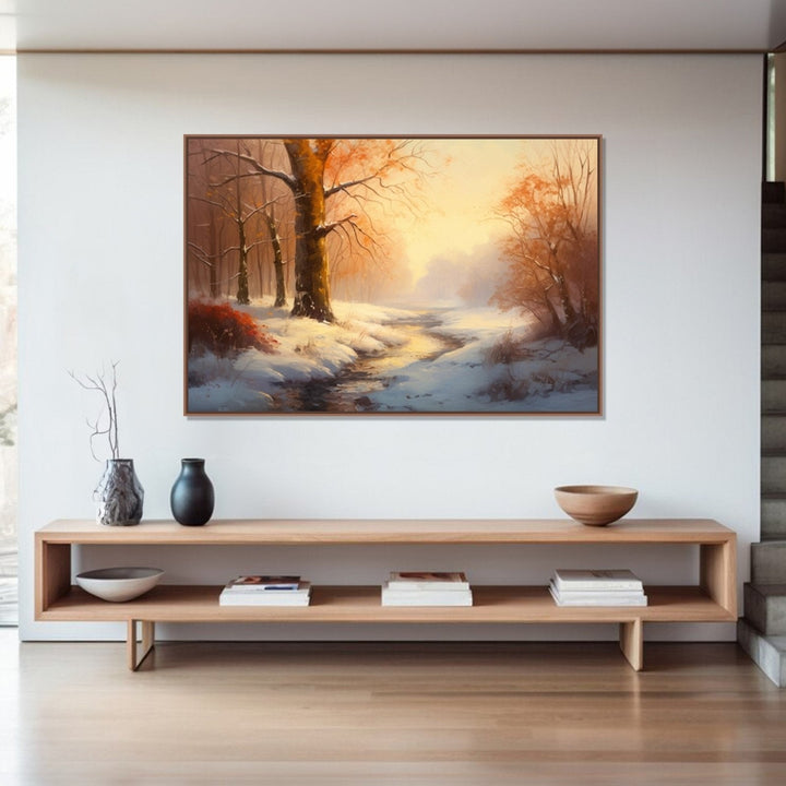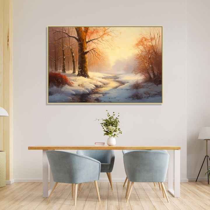 In 'Winter Light 2', a stream flows through a snow-covered ground, and yellow-leafed trees add a touch of warmth to the winter scene. The painting encapsulates the tranquil beauty of a winter landscape.