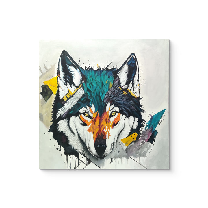 This painting depicts a majestic wolf in vibrant teal green and yellow-orange hues, capturing the essence of a mystical encounter with nature. Piercing yellow eyes showcases the intensity of ruthlessness in nature and fight for survival.