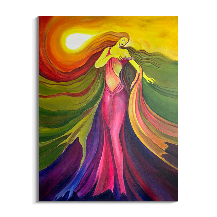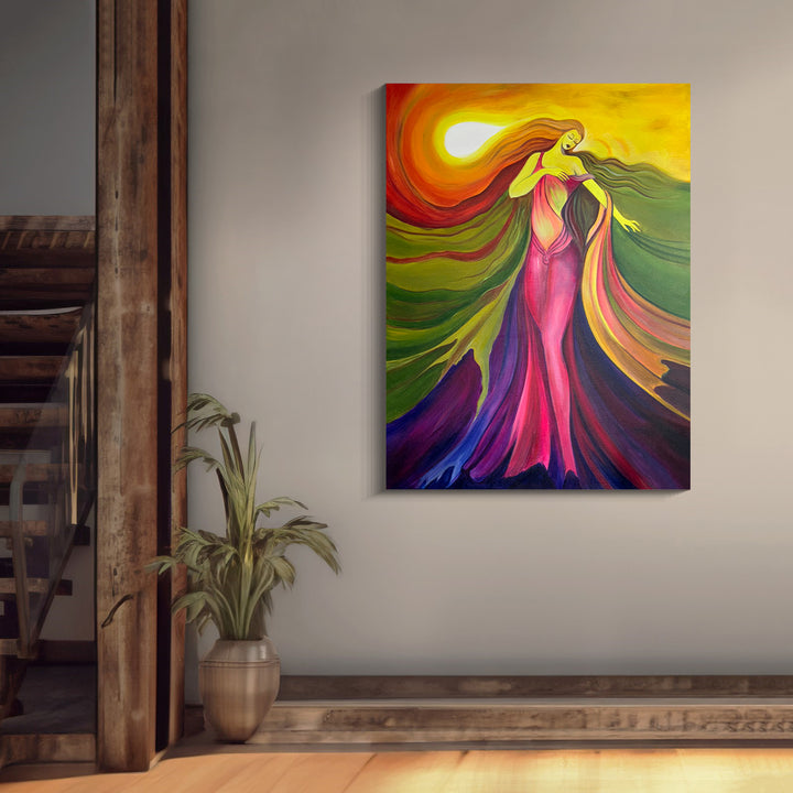 This painting shows a graceful figure in a flowing, vibrant dress with hues of red, orange, and purple, set against a radiant, sunlit background. The swirling lines and warm colors create a sense of movement and energy, making the artwork visually captivating and evocative.