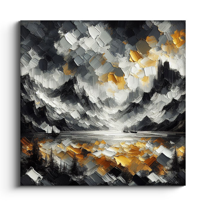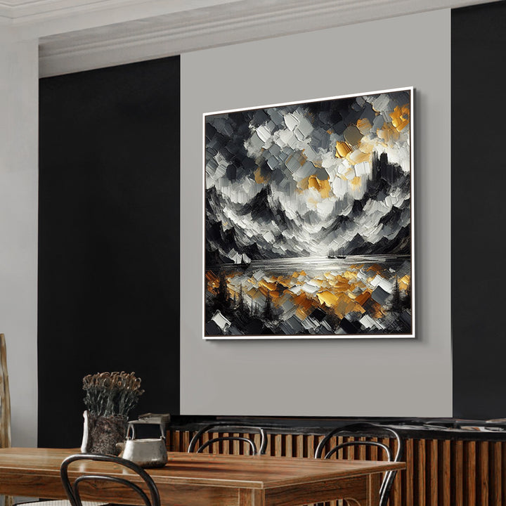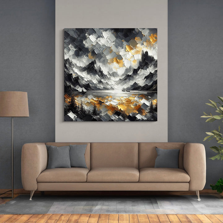 This impressionistic or abstract-style landscape painting captures the essence of serene mountains and reflective waters. The bold, textured brushstrokes depict a rugged mountain range. Peaks and valleys emerge in black, white, and gray tones, creating a dynamic composition. Throughout the painting, touches of gold or yellow add luminosity. These accents may represent sunlight or spiritual illumination. The golden hues concentrate near the horizon line, suggesting either a sunrise or sunset. At the base of the mountains, a body of water mirrors the surroundings. The use of contrasting colors adds energy to the scene. A small silhouette boat on the water, anchoring the composition. The artwork exudes both tranquility and vibrancy, inviting viewers to contemplate the beauty of nature.